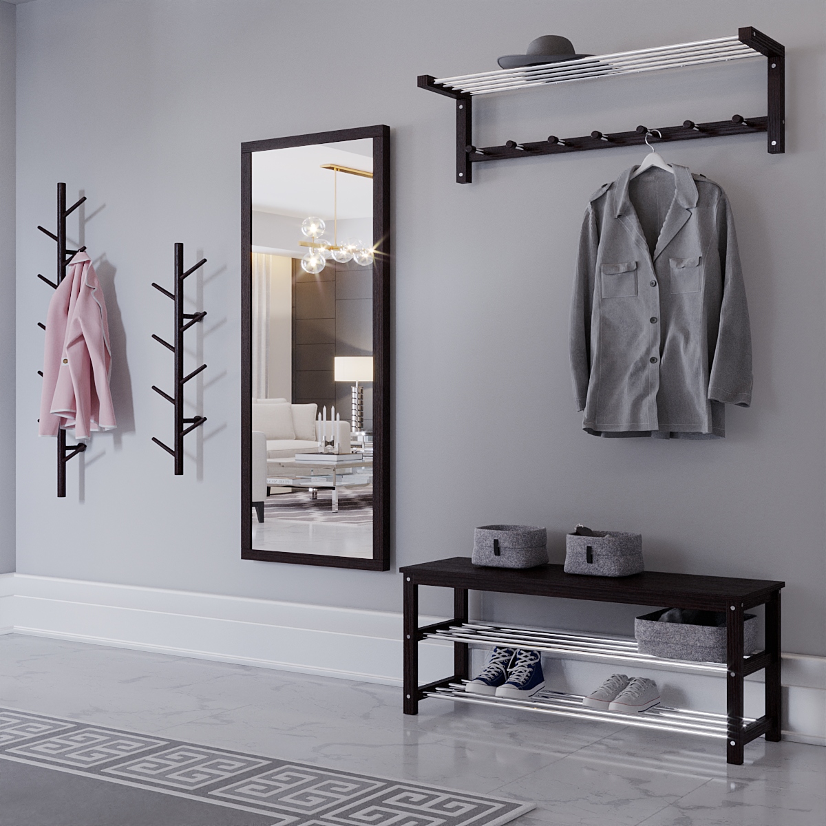 Меблева фабрика Fenster розробила ряд сучасних комплектів меблів з акуратним та продуманим дизайном, виготовленим у єдиному стилі. Оптимальний розмір та форма наших виробів багато в чому відповідає більшості існуючих передпокоїв. Наприклад, у тісному передпокої не завжди помістяться великі корпусні меблі, до того ж виглядати вони будуть більше на заваді, ніж нести свій функціонал. У такому випадку з проблемою зберігання речей може допомогти підлогова стійка, тип: відкрита шафа. Серія «Галлант» - це вішалка підлогова з плічками для одягу, що замінює стандартну шафу, але при менших габаритах. Всі моделі мають верхню полицю, а деякі ряд бокових полиць для декору і зберігання речей.