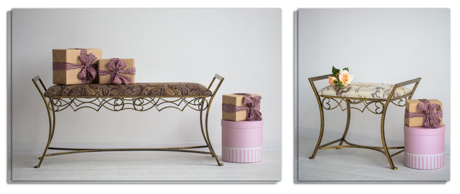 Міцний матеріал, що не витирається з роками, має складний малюнок із вплетеними золотими та срібними нитками. Деякі з наведених варіантів мають різні габаритні розміри, але при цьому виконані в єдиному стилі. Це чудова можливість створювати необхідну композицію у будинку. Кована банкетка – це гарантовано меблі на роки без перебільшення, до того ж доступну ціну на банкетку з металу Ви зможете знайти лише у нас.