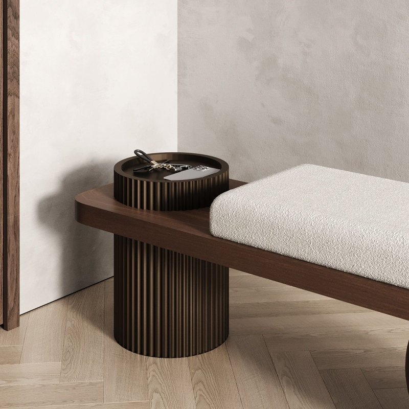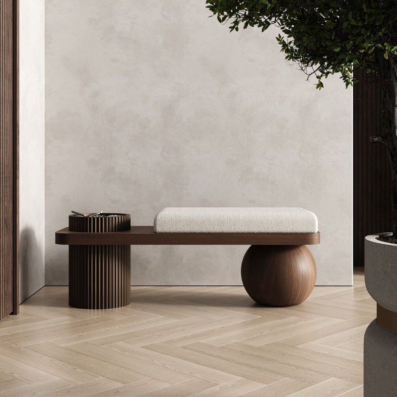 Основа банкетки — МДФ, покрите шпоном дуба або американського горіха, що надає конструкції глибини, натуральної текстури та тепла. Шпон чудово імітує вигляд масиву дерева, при цьому не деформуючись з часом, є більш стабільним та стійким до перепадів температури й вологості. Така поверхня не лише приваблива, але й практична — легко очищується, приємна на дотик і довго зберігає естетичний вигляд.