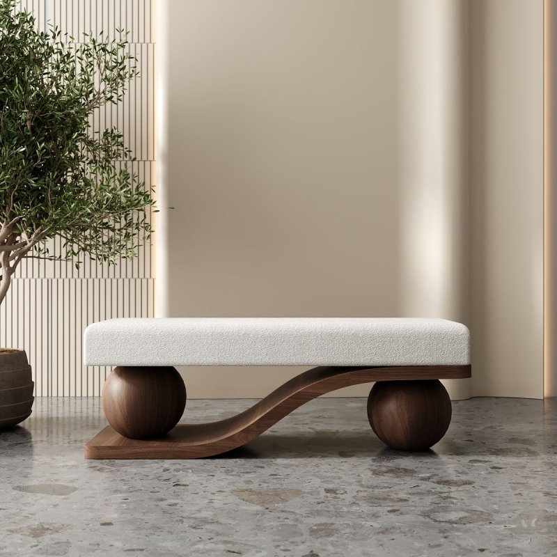 - Корпус банкетки виготовлений з МДФ, покритого шпоном дуба або американського горіха. Таке поєднання забезпечує міцність, стабільність конструкції та глибину природної текстури дерева.