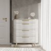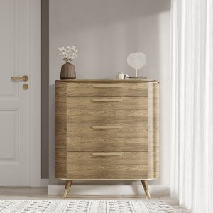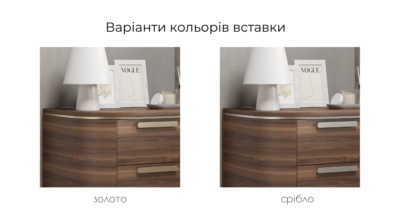 Завдяки чотирьом відділам комода та внутрішній організації виробу структурування речей відбувається легко та компактно. На вибір пропонуємо різноманітні варіанти шпону. Варіанти кольорів вставки - золото або срібло. Стільниця вдало розмістить різноманітний декор, гаджети або техніку. Комод для речей наділений оптимальними габаритними розмірами. Це дозволяє вдало розмістити його як у вітальні, так і спальні або передпокої.
