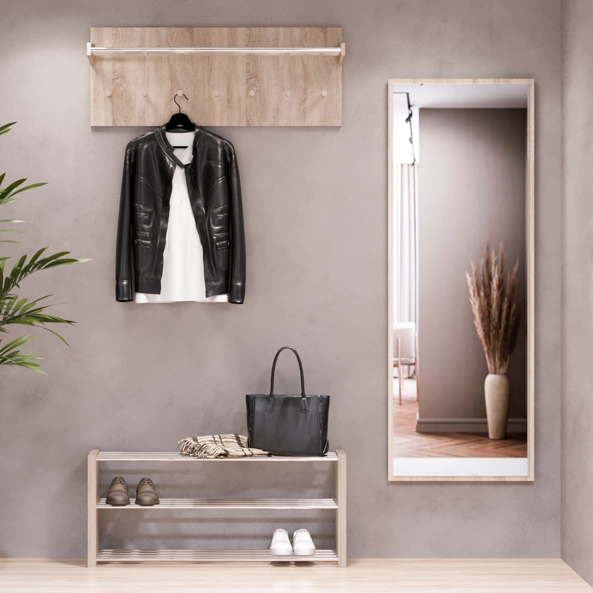 До того ж, на відміну від закритої шафи, дана форма зберігання дозволяє якісно просушити та провітрити речі, що украй важливо для верхнього одягу. Якщо ви бажаєте купити настінну вішалку у складі готової передпокою, рекомендуємо звернути увагу на наші нові розробки: передпокій “Гавана 1” - компактна підставка для взуття ідеально доповнює вішалку за стилем та виконує функцію органайзера. "Гавана 2" - велике настінне дзеркало вдало поєднується з вищезгаданими елементами і надає передпокої завершеного вигляду.