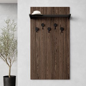 Вішак виготовляється у мінімалістичному дизайні, що гармонійно поєднує текстуру дерева та міцність металу. Фрезероване МДФ, покрите шпоном дуба або американського горіха, додає виробу унікальної текстури. Патинування створює ефект природного старіння дерева, надаючи йому глибини та характеру. А гачки та полиця забезпечують надійність та витримують значне навантаження. Використання при виробництві натуральних матеріалів гарантує довговічність та екологічність виробу.