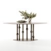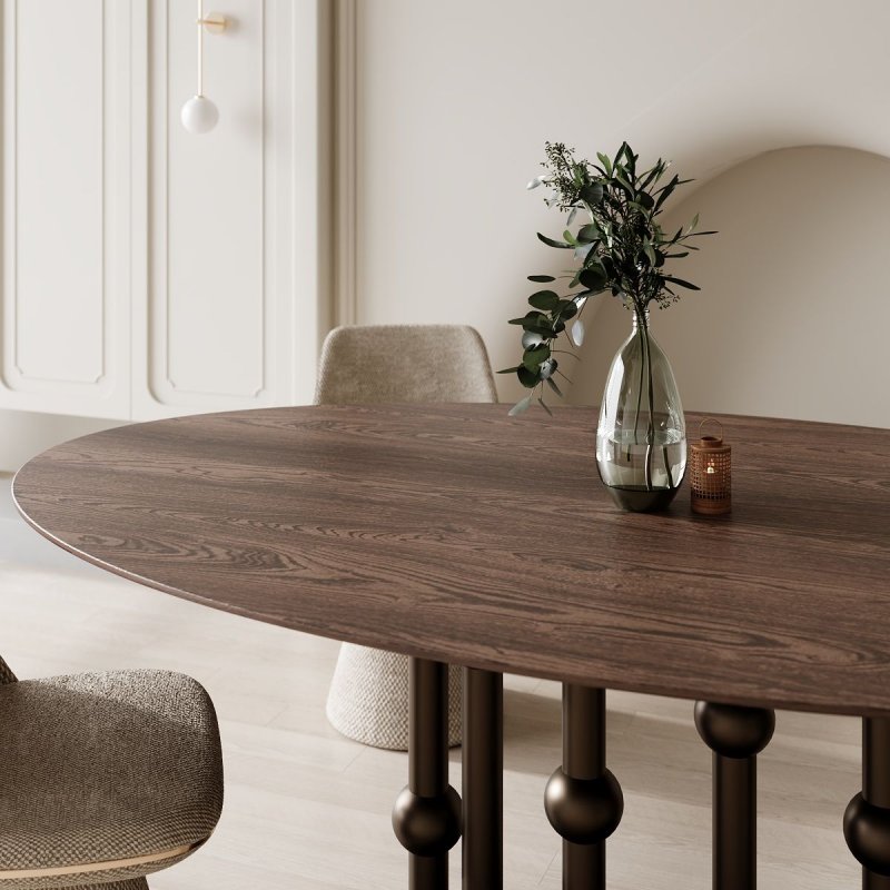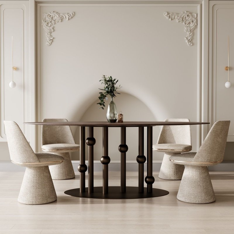 Розміри столу дозволяють розмістити навколо достатню кількість стільців для комфортного прийому гостей або щоденного використання. Особливу увагу привертають ніжки, які виконані у вигляді композиції з вертикальних опор та круглих елементів. Така форма нагадує сучасну скульптуру й додає інтер’єру вишуканості.