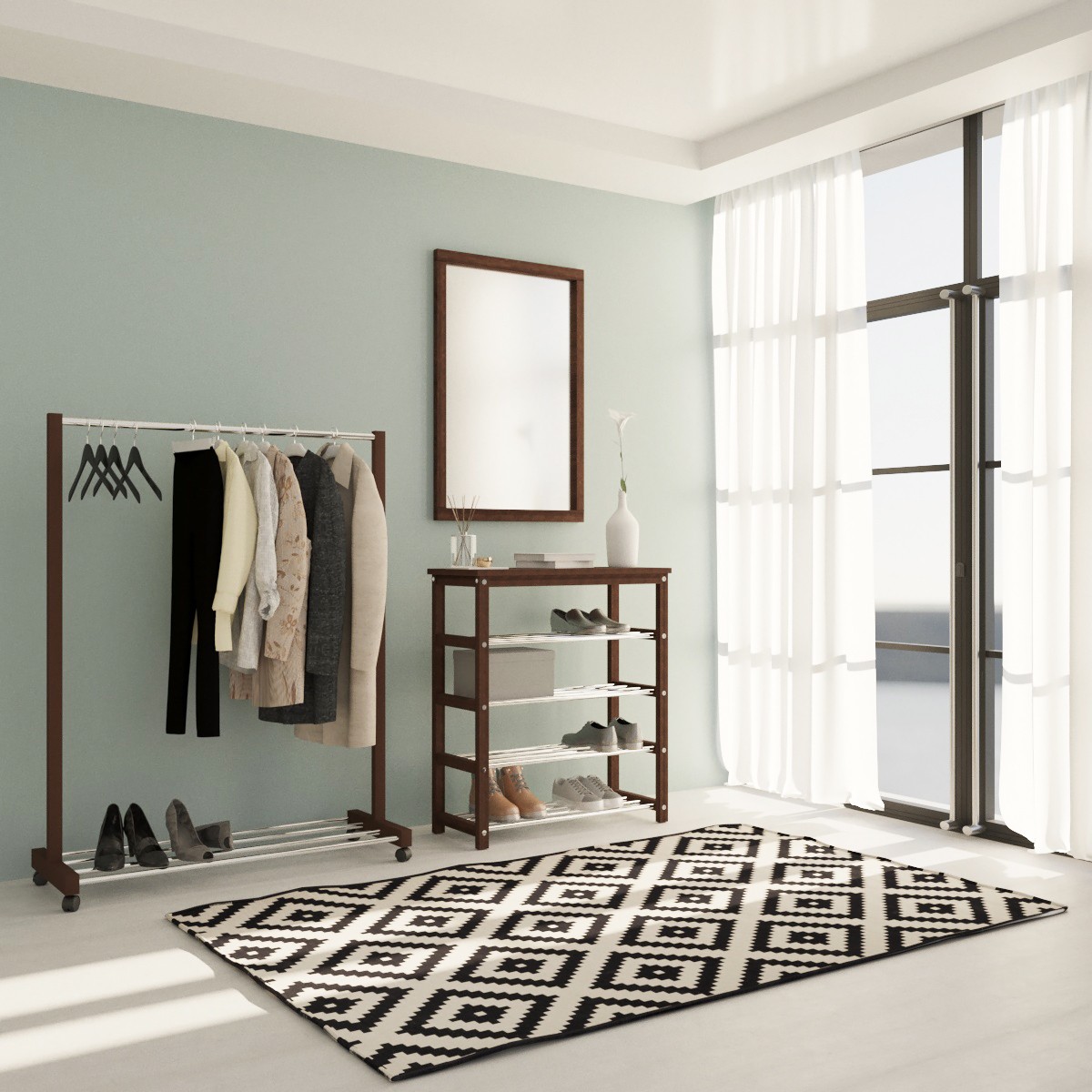 Якщо ви бажаєте купити не тільки підставку для взуття, але й інші меблі для передпокою, зверніть увагу на наші новинки виробництва. Передпокій "Невада 7" - крім вищеописаної підставки, включає невелике настінне дзеркало з дерев'яною рамою, а також стійку для одягу. Стійка має коліщатка, що обертаються, тому буде дуже зручна для всіх, хто любить часті перестановки. Коліщата вільно обертаються на 180o, і вам легко буде переміщати вішалку навіть з одягом.