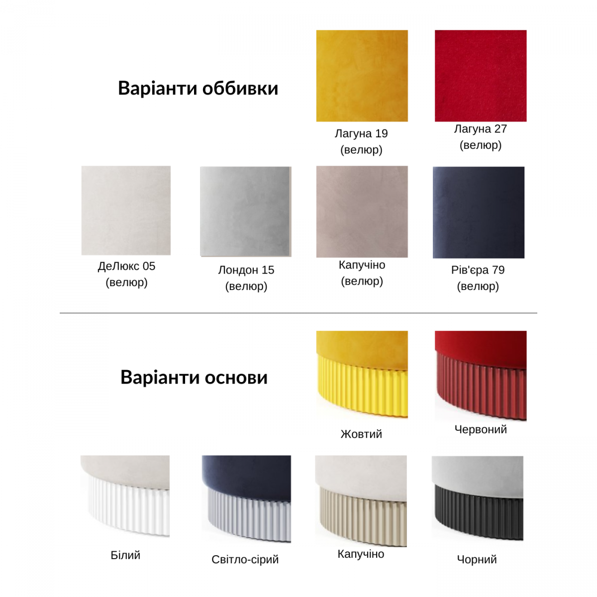 Пуф "Пунто" - новинка нашого виробництва, комфортне та красиве доповнення вашого будинку.Ми пропонуємо вашій увазі дванадцять найрізноманітніших варіацій кольору велюру та основи, ми підібрали найцікавіші комбінації кольору, щоб ви точно змогли підібрати модель за смаком і поєднувати її, з чимось доповнюючим. Конструкція пуфа нерозбірна, Вам не потрібно докладати жодних зусиль при отриманні. Основу складає пофарбований МДФ, високоякісна деревоволокниста плита середньої щільності, що відрізняється тривалим терміном використання, а також популярний матеріал у виробництві меблів.