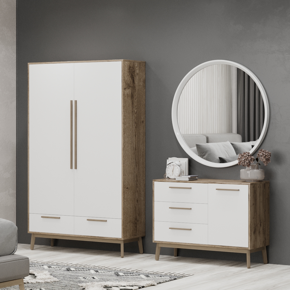 Шафа в кімнату представлена у трьох популярних на сьогодні кольорах: білий, білий/аліканте, білий/дуб сонома, чорний/дуб сонома, аліканте/чорний. Такі кольори не тільки додадуть свіжості та світла, а й візуально розширять ваш інтер'єр. Покрита шафа в кімнату двокомпонентним поліуретановим лаком, що є стійким до різних впливів та надає виробу довговічності.