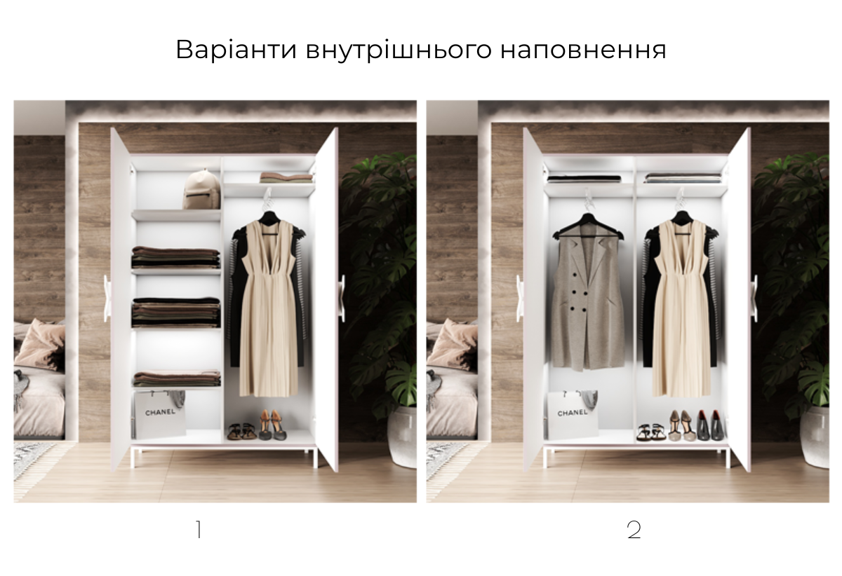 Розмір шафи (ВхШхГ): 1820x1140x400 мм. Він є не лише функціональним доповненням до спальні, а й прикрасою всього інтер'єру. Виріб чудово виглядатиме як біля стіни, так і в будь-якому іншому місці кімнати. Продумане внутрішнє наповнення шафи дозволяє зручно розмістити одяг, аксесуари, взуття усієї сім'ї як разом, так і поділивши на персональні відділення.