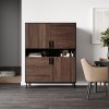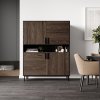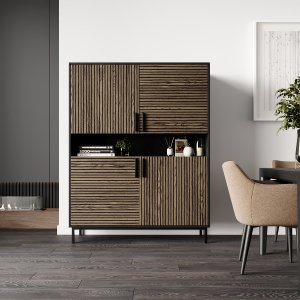 Фрезероване МДФ, покрите шпоном дуба або американського горіха, додає розкішного вигляду, унікальності, роблячи стелаж справжнім витвором мистецтва. ЛДСП – забезпечує довговічність та простоту догляду. Металевий каркас додає міцності та довговічності конструкції, забезпечуючи стійкість навіть при максимальному навантаженні. А ручки з масиву берези – стильний і натуральний акцент, що має приємну на дотик текстуру та підкреслює природну красу виробу.