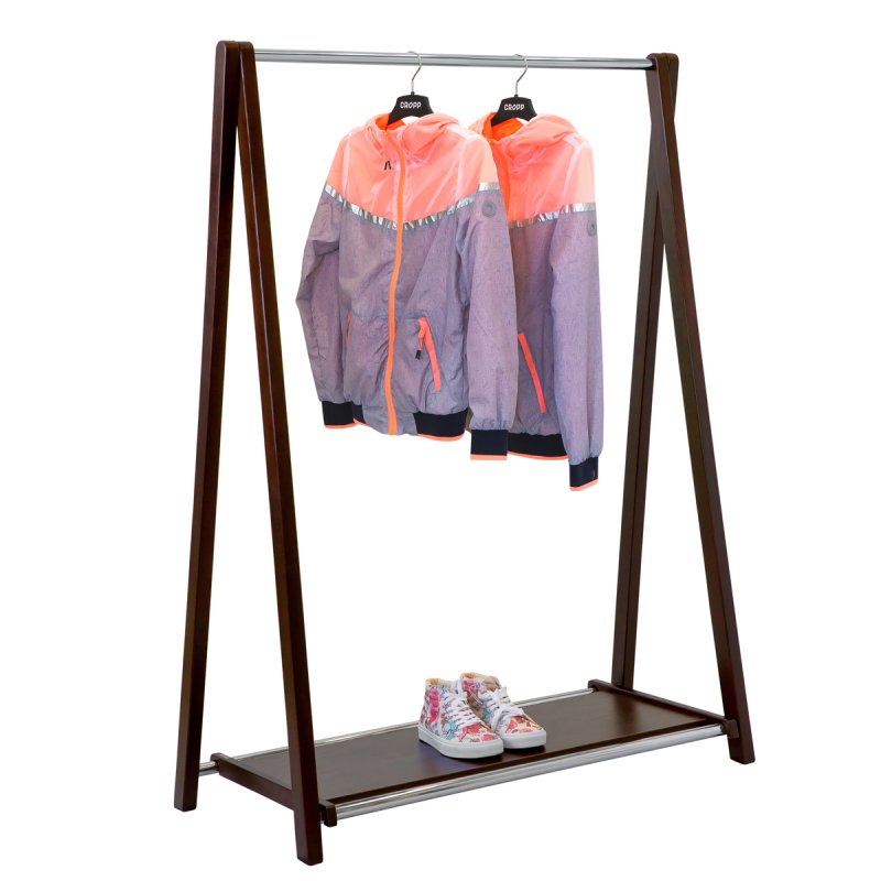 Стійка для одягу Модус 2П виготовлена з натурального дерева, тримач для вішалок виконаний з хромованої труби. На відміну від моделі Модус 2, в ній є нижня поличка, зручна для зберігання взуття або ящиків для дрібниць. Дерев'яні частини покриті поліуретановим лаком італійського виробництва, що створює стійке та міцне покриття. Вішалка підлога стійка Модус 2П має міцну і надійну конструкцію і здатна витримати великі навантаження, що дозволяє її використовувати і для верхнього одягу.