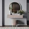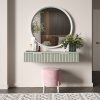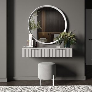 Трюмо Редісон комплектується класичним столиком, дзеркалом круглої форми та компактним пуфом. Настінне кріплення – це завжди зручно та надійно. Дзеркало діаметром 900 мм сприяє не тільки комфортному використанню, а й візуальному розширенню та освітленню кімнати. Дві висувні шухляди столика відкриваються із легкістю. Чудове місце для зберігання необхідних дрібниць повсякденного використання.