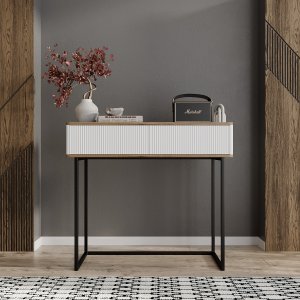 Лаконічний дизайн туалетного столика «Нео» підходить як для сучасних, так і класичних інтер’єрів. Гармонійне поєднання дерев’яної текстури, металу і рельєфного фасаду створює стильний акцент у спальні, гардеробній чи будь-якій іншій кімнаті.