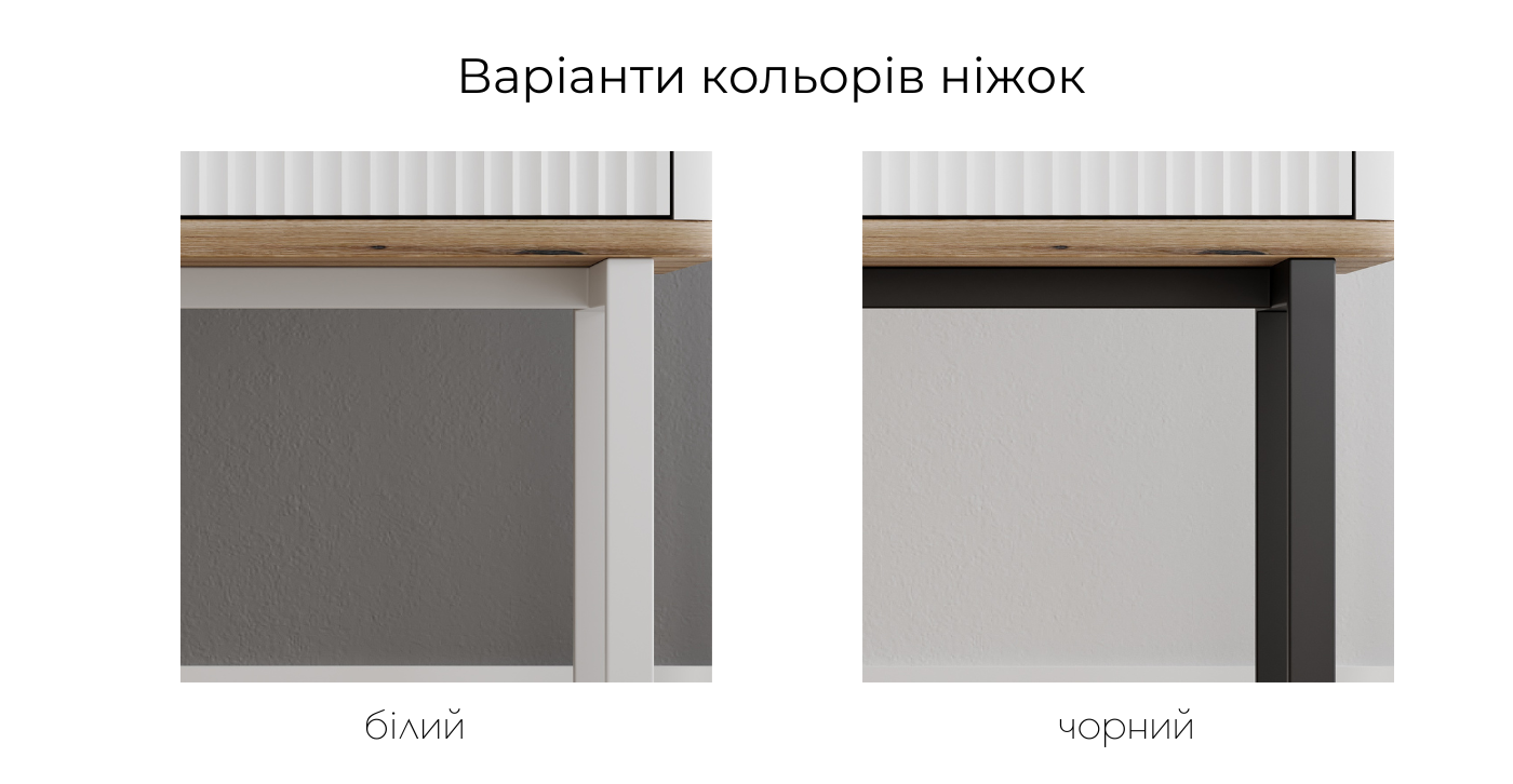 Дана модель виготовляється з високоякісних та надійних матеріалів, що гарантують довгі роки експлуатації. Металеві ніжки забезпечують міцність та стійкість конструкції, каркас з ЛДСП (ламінована деревостружкова плита) додає естетики та довговічності, а фасад з МДФ, покритого ПВХ-плівкою, захищає поверхню від вологи, подряпин і механічних пошкоджень.