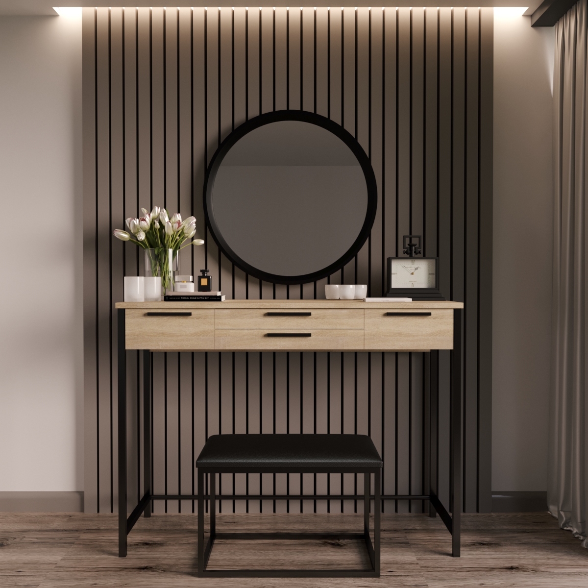 Можете купити туалетний столик окремо або як спальний гарнітур "Візаві Чорний". В даний комплект входить кругле дзеркало настінне "Токіо-600" і банкетка "Мартина". Якщо розмістити дзеркало над столом і сісти на м'який пуф, наносити макіяж стає абсолютно комфортно. Усі складові виконані в єдиному стилі та гармонійно доповнюють один одного.