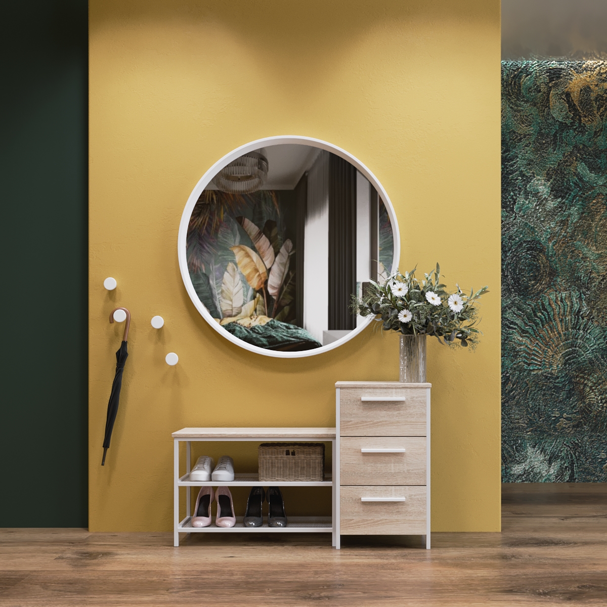 Металева основа виробу у поєднанні з полицями з ЛДСП зможуть надійно влаштуватися у вашому будинку та прослужити довгі роки. Метал захищений від вологи та вогкості за допомогою порошкового термофарбування. Сама конструкція дуже стійка, на тумбі можна розміщувати сумки, аксесуари чи предмети інтер'єру. Дві полиці для взуття, три висувні ящики розмістять все ваше взуття та інші супутні дрібниці.