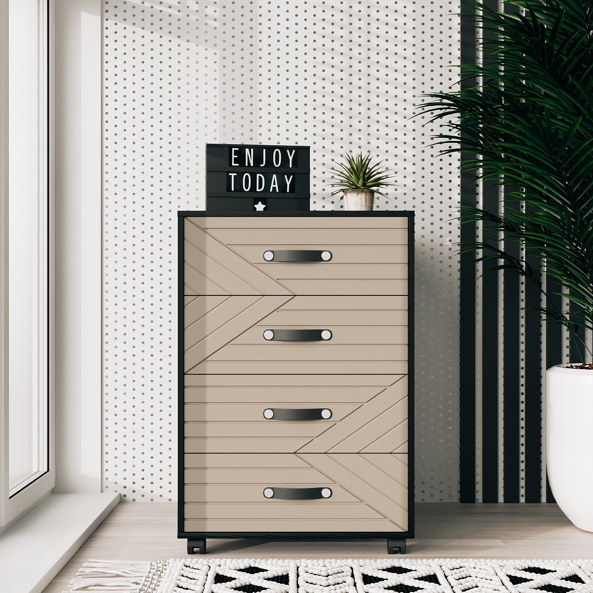 Ми пропонуємо комод на колесах у зручному розмірі: 750х500х400 мм. Прямокутна форма є найбільш практичною та універсальною. Висота та ширина стільниці дозволяють також поставити на неї квіти, фотографії та інші предмети декору. А коліщата роблять виріб ще більш мобільним, дозволяючи з легкістю переміщати його в потрібне місце. Комод на 4 ящики на колесах представлений у шести яскравих та стильних відтінках (жовтий, какао, лагуна, елегант грей, грін айс та лаванда). Каркас та ручки виконані в чорному кольорі, що надає виробу універсальності. На нашому сайті ви можете знайти тумби Марокко ще в білому кольорі та аліканті. А також підібрати письмовий стіл, який ідеально доповнить композицію та додасть їй завершеності.