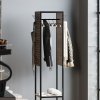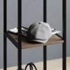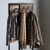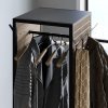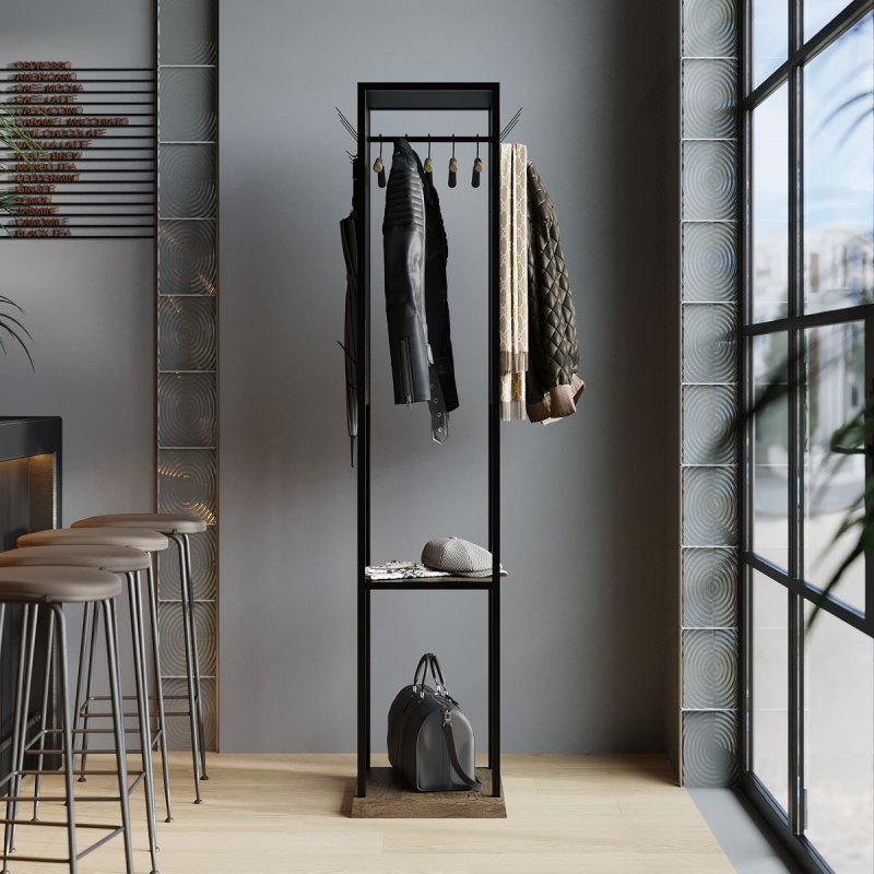 Цей вішак виготовляється з металу та шпонованого МДФ. Цікавою особливістю конструкції є фрезерування, яке надає об’єму та рельєфності дерев’яним елементам. А завдяки патинуванню виріб набуває глибини та характеру, підкреслюючи структуру шпону та створюючи ефект зістареного дерева. Каркас виготовлений із чорного металу, що ідеально контрастує з дерев’яними елементами.