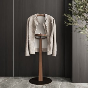 Каркас вішака виготовляється з МДФ, покритого шпоном дуба або американського горіха, що поєднує міцність з елегантністю. Такий матеріал гарантує високу зносостійкість, не деформується з часом та зберігає вишуканий вигляд при щоденному використанні. Металева основа забезпечує стійкість та додає вішаку сучасності.