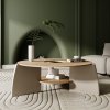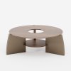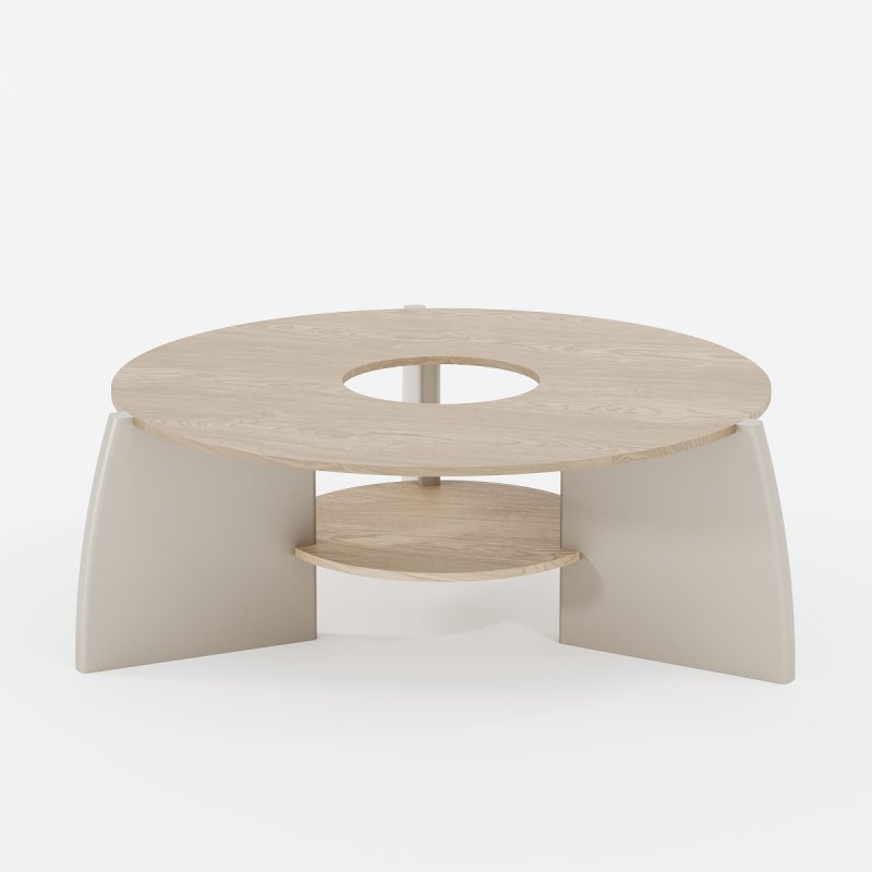 Кругла стільниця з отвором по центру створює ефект легкості, а плавні лінії ніжок додають витонченості. Поєднання двох рівнів дозволяє зручно розташувати декоративні предмети зверху, а книги, журнали та різні дрібниці розмістити на нижній полиці.