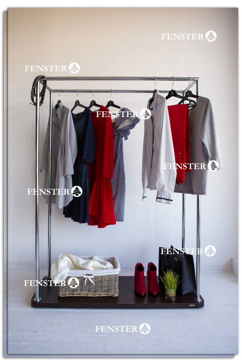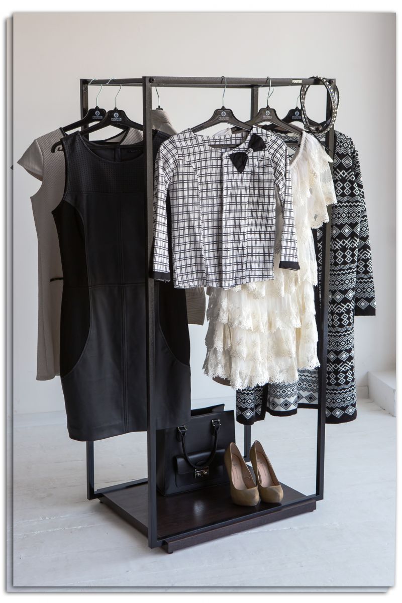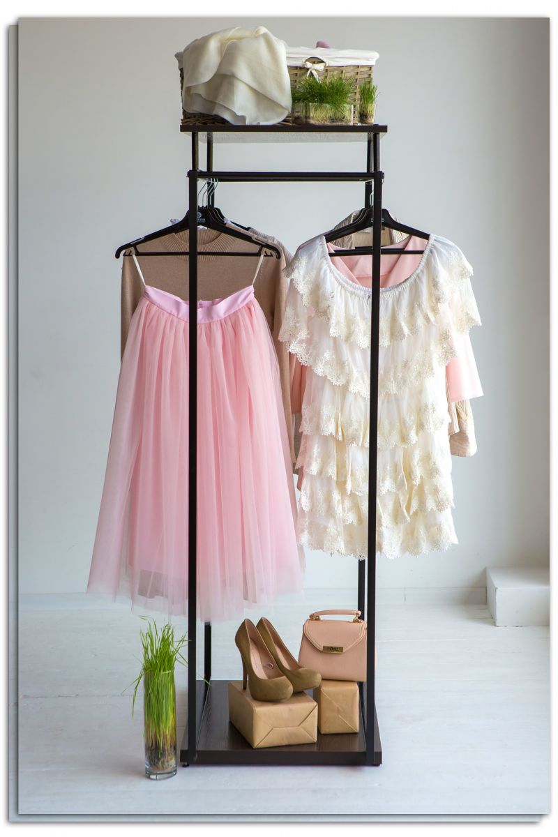 Вот мы и разобрались что такое рейл для одежды, а теперь поговорим какой материал производители используют при производстве напольных вешалок и стоек. В первую очередь перекладина должна быть достаточно прочной, чтобы выдерживать большое количество вещей, поэтому чаще всего в качестве материала используют металл. Это могут быть круглые полые трубки с хромированным покрытием или труба квадратного сечения, покрашенная в различные оттенки. Главное достоинство рейла – это несомненно демонстрация гардероба и непосредственное хранение одежды. Напольные стойки этого типа могут оснащаться колёсиками для их большей мобильности и удобства. Специальные полки для хранения и показа обуви также могут быть включены в конструкцию.