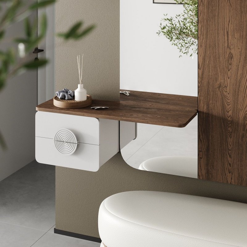 Основу конструкции составляет МДФ, облицованный шпоном дуба или американского ореха. Такое решение обеспечивает прочность, стабильность и выразительную текстуру натурального дерева. Металлические элементы подчёркивают геометрию и добавляют современный характер.