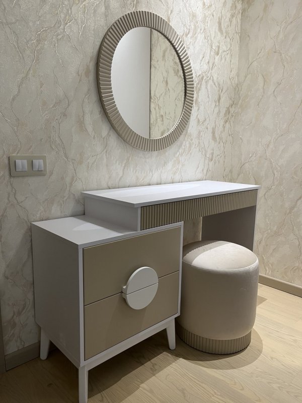 Отличным дополнением к столу стала встроенная тумба с двумя выдвижными ящиками для удобного хранения. На поверхности стола могут изящно разместиться парфюм, ваза с цветами, фото рамка и другие вещи, что дарят вдохновение ежедневно. Компактный пуф придает изделию завершенный вид. Его мобильность позволяет без усилий перемещать его как в средине комнаты, так и за ее пределами.