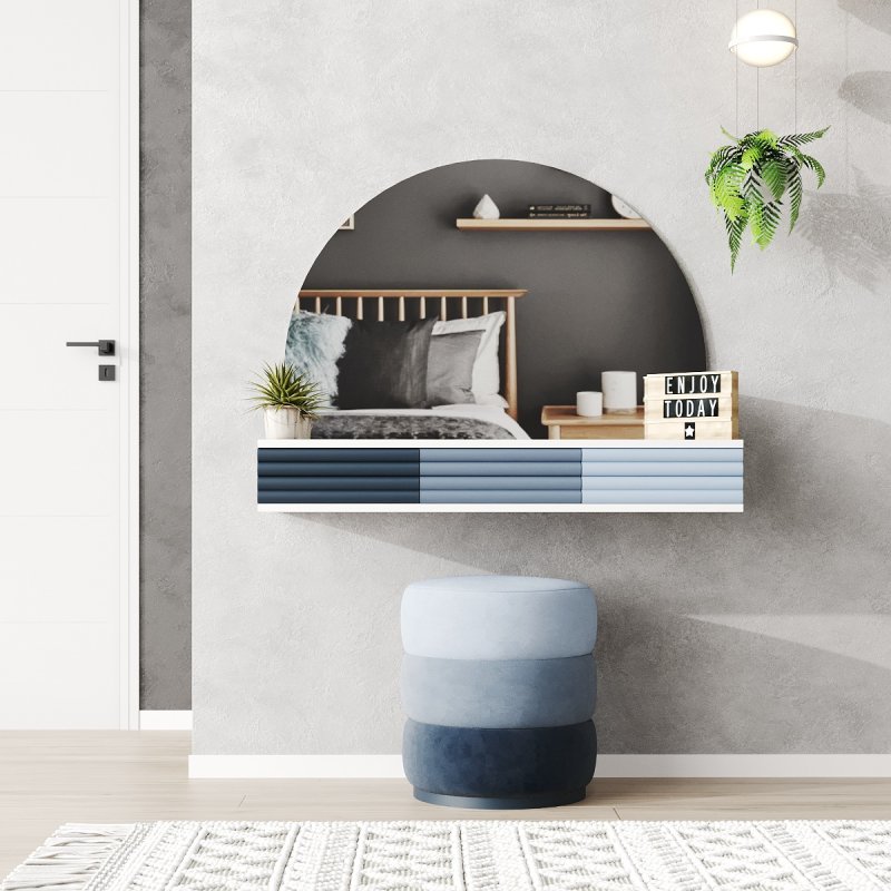 Обязательное дополнение изделия – изысканное зеркало для утренних и вечерних ритуалов красоты. Мягкий пуф, обивкой из велюра, обеспечит комфортное использование. Освещённая естественным светом часть комнаты – лучшее место для установки комплекта. Широкая цветовая палитра предлагается на выбор: от белого-какао до черного-лазурь. Высокое качество изделий способствует использованию на долгие годы. Столик изготовлен из ДСП и МДФ. Дизайн в стиле минимализма удачно гармонирует с рядом современных по выбору цветов. Комплект может служить как по отдельности, так и создавать композицию с другими предметами серии Компанит. Сочетайте смело!