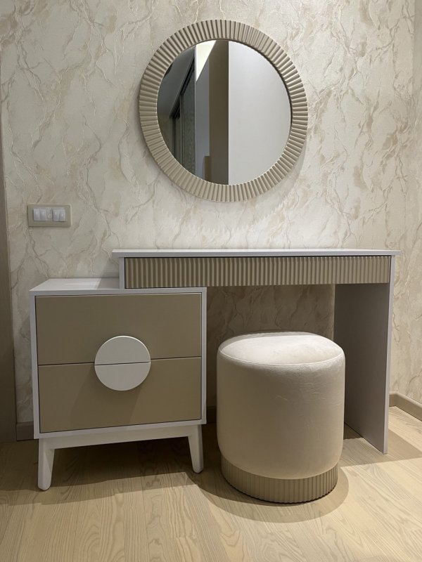 Данная модель представлена без зеркала. Дает возможность купить его отдельно, исходя из ваших пожеланий по форме и размеру, поставить его на стол или повесить на стену. Также в разделе Банкетки вы можете подобрать пуф, который станет отличным дополнением к трюмо и придаст ему завершенный вид.