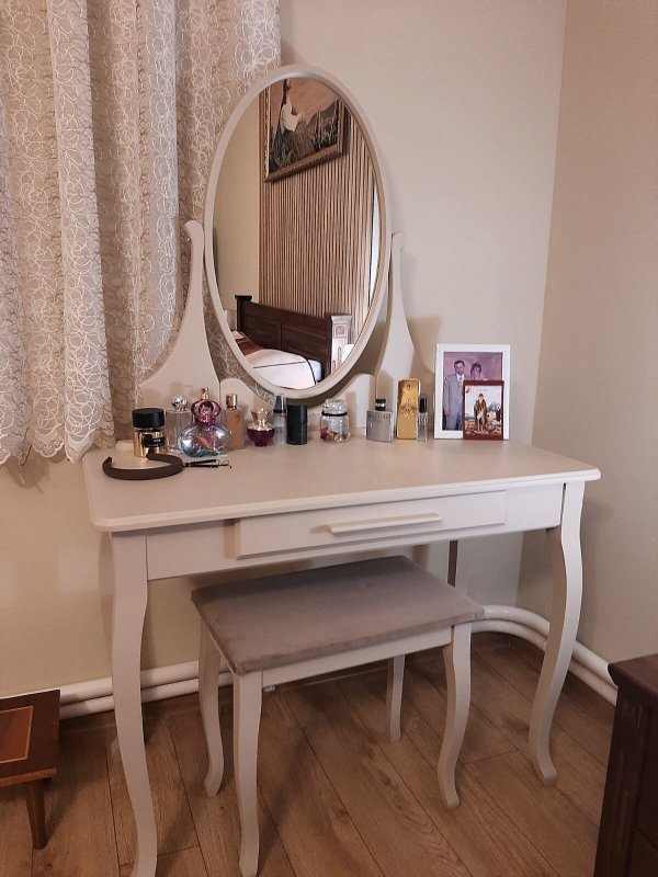 Столик для макияжа имеет столешницу из МДФ, этот современный материал также относится к экологически чистым и безвредным. Если забота о здоровье – для вас не просто слова, можете смело приобретать такую мебель в свой дом. Столешница дополнена удобным выдвижным ящиком для хранения различных косметических средства и аксессуаров.