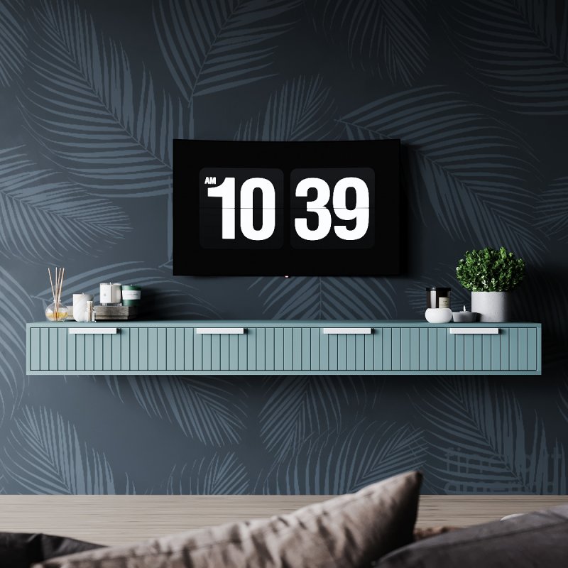 Тумба под тв в стиле лофт крепится непосредственно к стене, что придает ей воздушности и легкости. Подвесная конструкция удобна тем, что высоту установки вы определяете сами, в зависимости от личных предпочтений. Удобные закрытые полочки позволяют спрятать туда всю необходимую мелочь от посторонних глаз. А на длинной столешнице хватит места для предметов декора, колонок, фотографий или вазы с цветами.