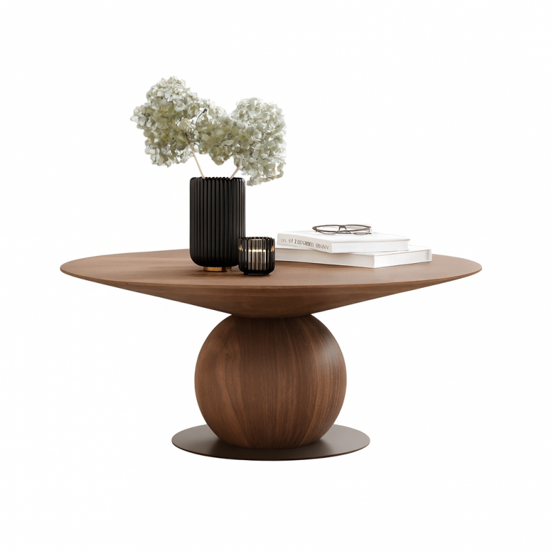 Основа столика – металлическая платформа, которая гарантирует надежную устойчивость конструкции. Центральный элемент — элегантный деревянный шар, поддерживающий столешницу, — не только функциональный, но и декоративный акцент, который делает этот столик настоящим украшением комнаты.